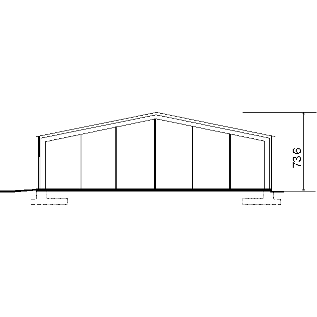 Projekt hali stalowej. Obiekt wolno stojący, parterowy, bez podpiwniczenia, z niskim dwuspadowym dachem, o uniwersalnym przeznaczeniu.
