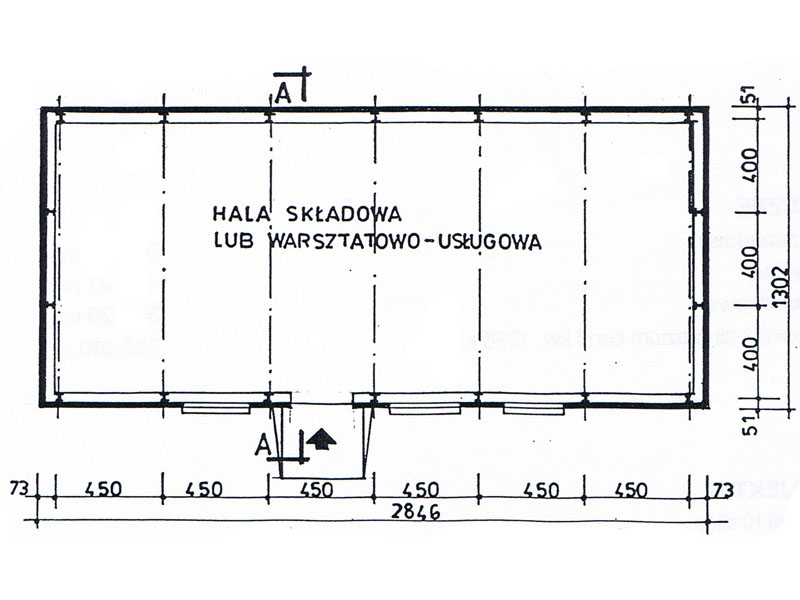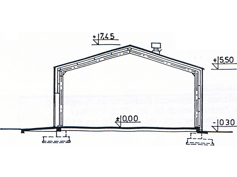 Projekt hali stalowej. Obiekt wolno stojący, parterowy, bez podpiwniczenia, z niskim dwuspadowym dachem, o uniwersalnym przeznaczeniu.